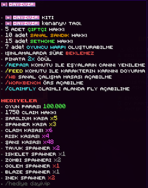 DayıMC, oyuncularına en eğlenceli ve en kaliteli Minecraft deneyimini yaşatan bir sunucu olacaktır. Sürekli gelen güncellemeler ile oyuncularımıza kaliteli hizmet sunmayı hedefliyoruz. Klasik bir Survival`dan başlayıp yeni oyunlar gelecektir.