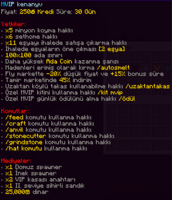 DayıMC, oyuncularına en eğlenceli ve en kaliteli Minecraft deneyimini yaşatan bir sunucu olacaktır. Sürekli gelen güncellemeler ile oyuncularımıza kaliteli hizmet sunmayı hedefliyoruz. Klasik bir Survival`dan başlayıp yeni oyunlar gelecektir.