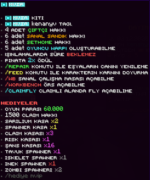 DayıMC, oyuncularına en eğlenceli ve en kaliteli Minecraft deneyimini yaşatan bir sunucu olacaktır. Sürekli gelen güncellemeler ile oyuncularımıza kaliteli hizmet sunmayı hedefliyoruz. Klasik bir Survival`dan başlayıp yeni oyunlar gelecektir.