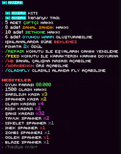 DayıMC, oyuncularına en eğlenceli ve en kaliteli Minecraft deneyimini yaşatan bir sunucu olacaktır. Sürekli gelen güncellemeler ile oyuncularımıza kaliteli hizmet sunmayı hedefliyoruz. Klasik bir Survival`dan başlayıp yeni oyunlar gelecektir.